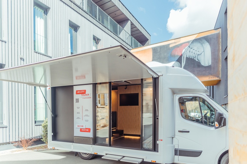 Der AK City Tourer präsentiert sich als eine hochwertige neue Promotionseinheit, die sich, ebenso wie alle Sonderfahrzeuge von AK Europe, individuell gemäß den Kundenwünschen frei konfigurieren lässt. Neben dem 3D-Logo auf dem Dach und der seitlichen Leuchtwerbung neben der Tür beeindruckt er, wie alle Einheiten von AK Europe, durch die Verwendung hochwertiger und sorgfältig ausgewählter Materialien. Dank seines einfachen Auf- und Abbaus zeichnet sich der AK City Tourer mit seinen 9m² durch eine hohe Flexibilität aus und ist bereits innerhalb von nur 3 Minuten einsatzbereit.