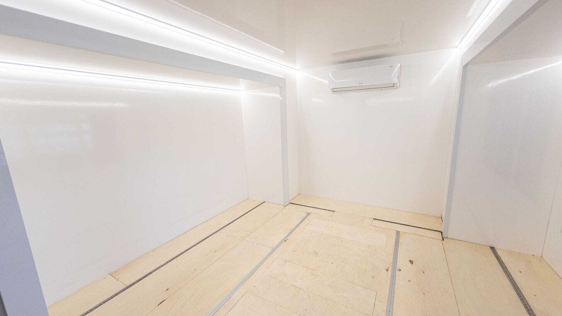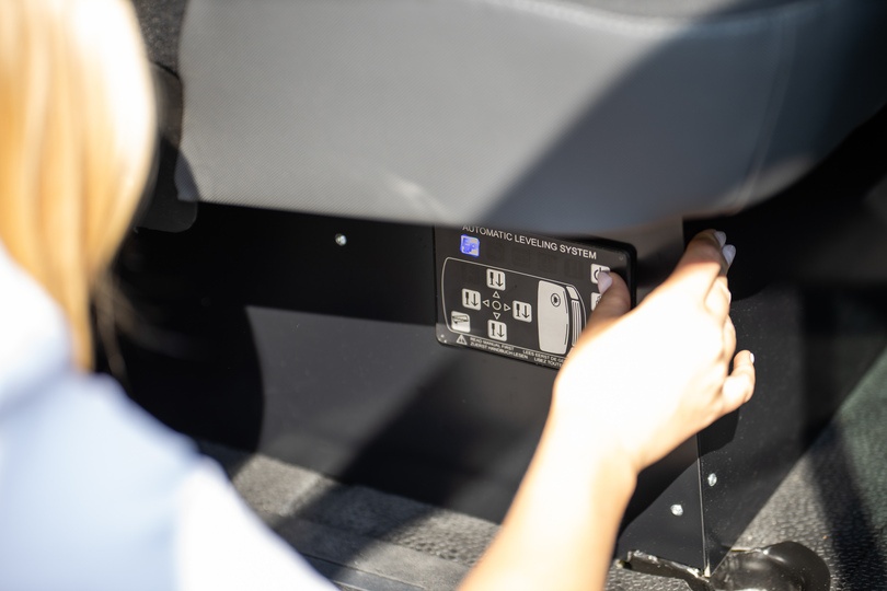 Dank der vier hydraulischen Stempel mit einer Tragekraft von 2.000kg pro Stempel, steht der AK Promo Tourer 3.5 auch auf unebenen Flächen völlig gerade. Die Einheit lässt sich mithilfe der Steuerung in der Fahrerkabine schnell und bequem automatisch nivellieren.
